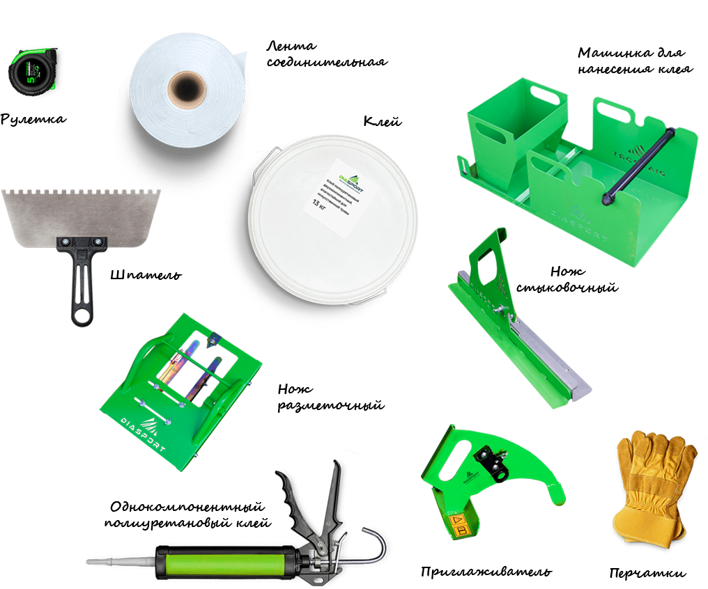 После того как края состыкованы и подрезаны можно начинать клеить полотна. Перед этим нам необходимо удостовериться, что все раскатанные рулоны расположены равномерно, Под ними нет каких-либо неровностей и ямок. Края полотен должны прилегать вплотную друг к другу. Для склеивания используется специальный клей и шовная лента. Далее необходимо отогнуть края рулонов, между ними положить ленту для швов, на нее нанести клей на расстоянии 5 см от края. После того как клей нанесен, края рулонов необходимо прижать к ленте и прокатить катком. На данном этапе укладка ландшафтной искусственной травы завершена. Если требуется монтаж спортивного покрытия, то подразумевается еще два этапа.